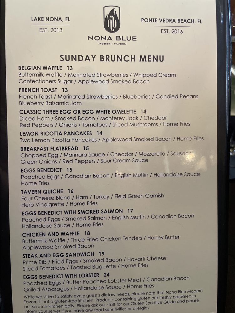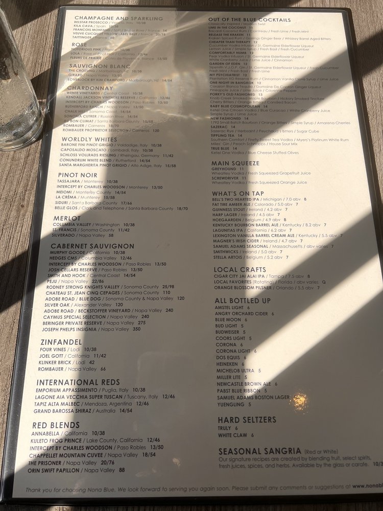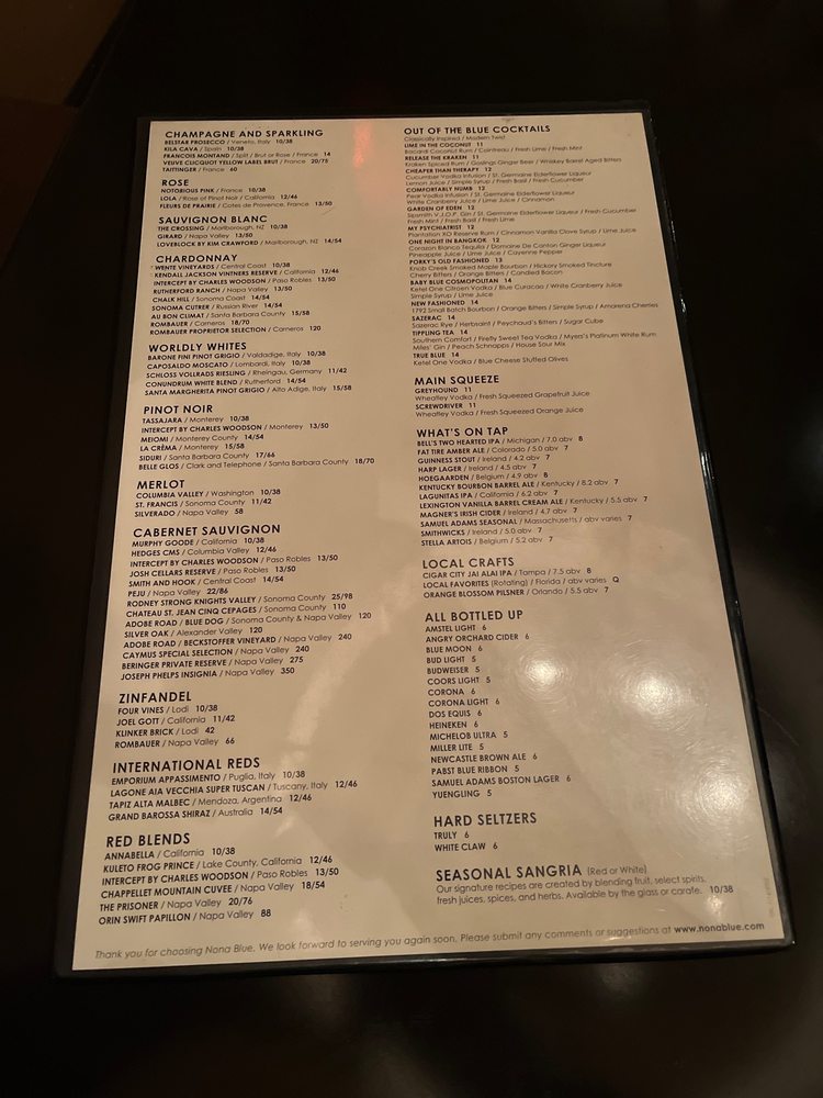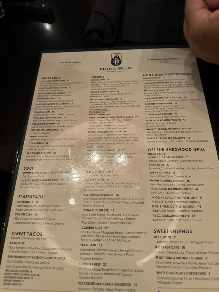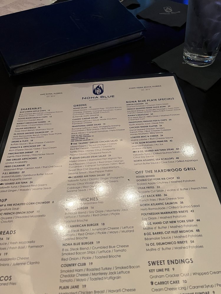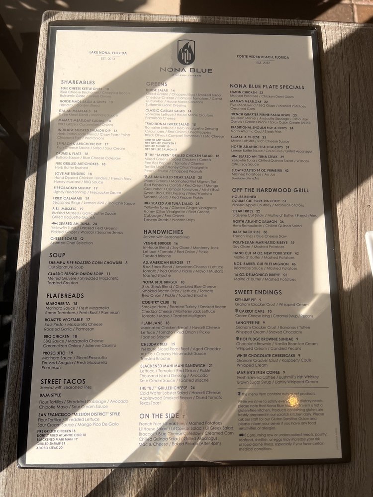 Introducing the menu at Nona Blue Modern Tavern, a casual yet classy diner offering American cuisine and a full bar. Located in Orlando, FL, this spot features shareables like Blue Cheese Kettle Chips and Mama's Meatloaf Sliders, along with delicious flatbreads such as Margherita and BBQ Chicken. Customer reviews rave about the outstanding service, with mentions of standout dishes like the housemade veggie burger and mahi mahi sandwich. The restaurant's ambiance is described as vibrant, with a loyal following and a bustling atmosphere. Whether you're looking for a relaxing lunch or a lively dinner, Nona Blue Modern Tavern has options for everyone to enjoy.